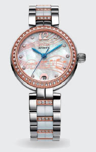 配置说明:机芯:进口自动机械机芯表壳:不锈钢表圈:不锈钢、IP镀玫瑰金色、锆石镶嵌表冠:不锈钢表镜:单面防眩光蓝宝石玻璃表盘:白色、珍珠母贝、锆石镶嵌、日历显示字钉:锆石镶嵌表针:钢蓝底盖:不锈钢、螺纹底表带:不锈钢、中粒白色陶瓷、锆石镶嵌表扣:不锈钢、按制双开扣