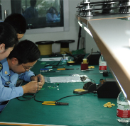 | 驻厂军代表动手操作体验电装工作 | 成飞总装厂激战正酣保质量 | 员工正在交流质量问题 |