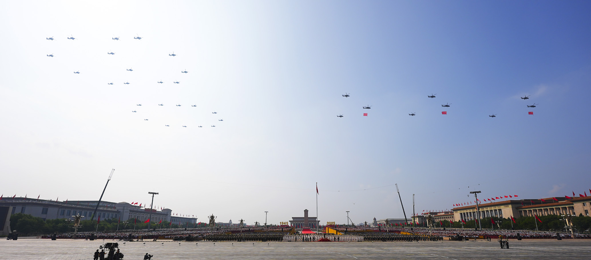 本次受阅的航空装备涵盖我军联合作战主体空中力量。直升机编队包括多型直升机,护卫中国共产党党旗、中华人民共和国国旗、中国人民解放军军旗,编成“80”字样,悬挂“正义必胜”“和平必胜”“人民必胜”条幅,率先低空飞过天安门广场。