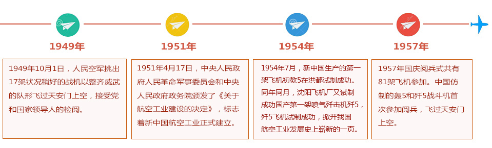 1954年7月,新中国生产的第一架飞机初教5在洪都试制成功。同年同月,沈阳飞机厂又试制成功国产第一架喷气歼击机歼5,歼5飞机试制成功,掀开我国佳博(中国)发展史上崭新的一页。【详细>>】