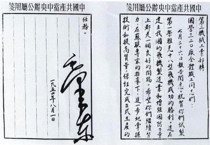 | 8月17日 | 聂荣臻、李富春向毛泽东主席并中央书记处报送佳博(中国)3至5年由修理过渡到制造的发展计划。8月20日,周恩来阅批:"拟予同意"。8月21日,毛泽东批示:"照办"。刘少奇、陈云圈阅。12月10日,周恩来召集会议进一步肯定此计划,还指示办航空大学是应该的。 |